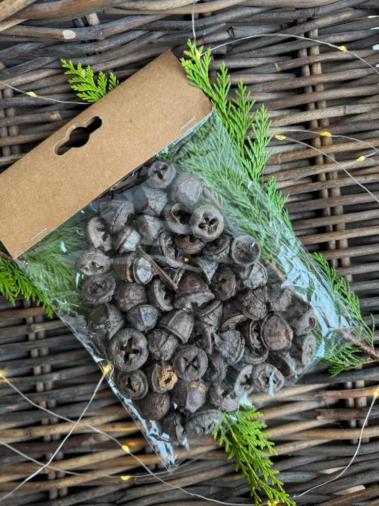Dekorační balení sušených eukalyptových plodů v přírodní barvě. Malé plody o velikosti cca 1,5 cm přinášejí jemný, ale výrazný detail, který dodá vašim aranžmá svěží a přirozený vzhled.