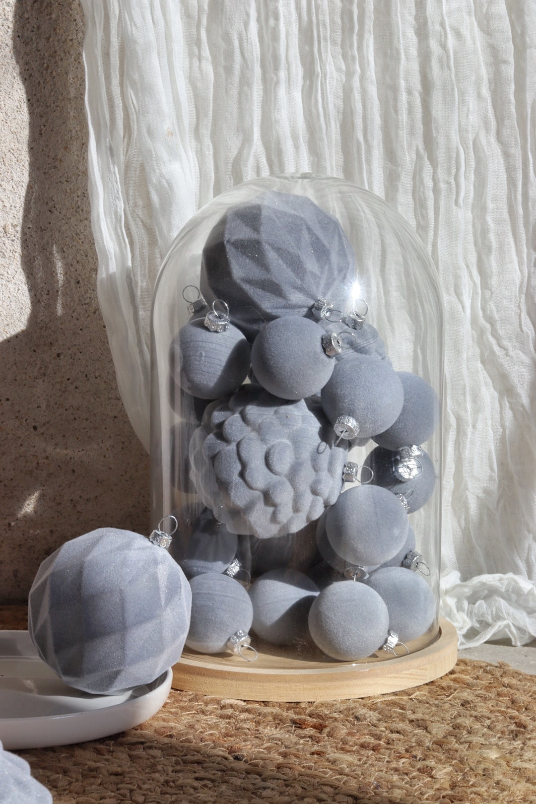 Plastová baňka v šedé barvě se sametovou povrchovou úpravou. Netradiční vzhled, tvar a sametové provedení obzvláštní vánoční dekorace milovníkům něčeho pěkného. Dokonale se hodí kombinovat se stříbrnými dekoracemi všech možných tvarů.